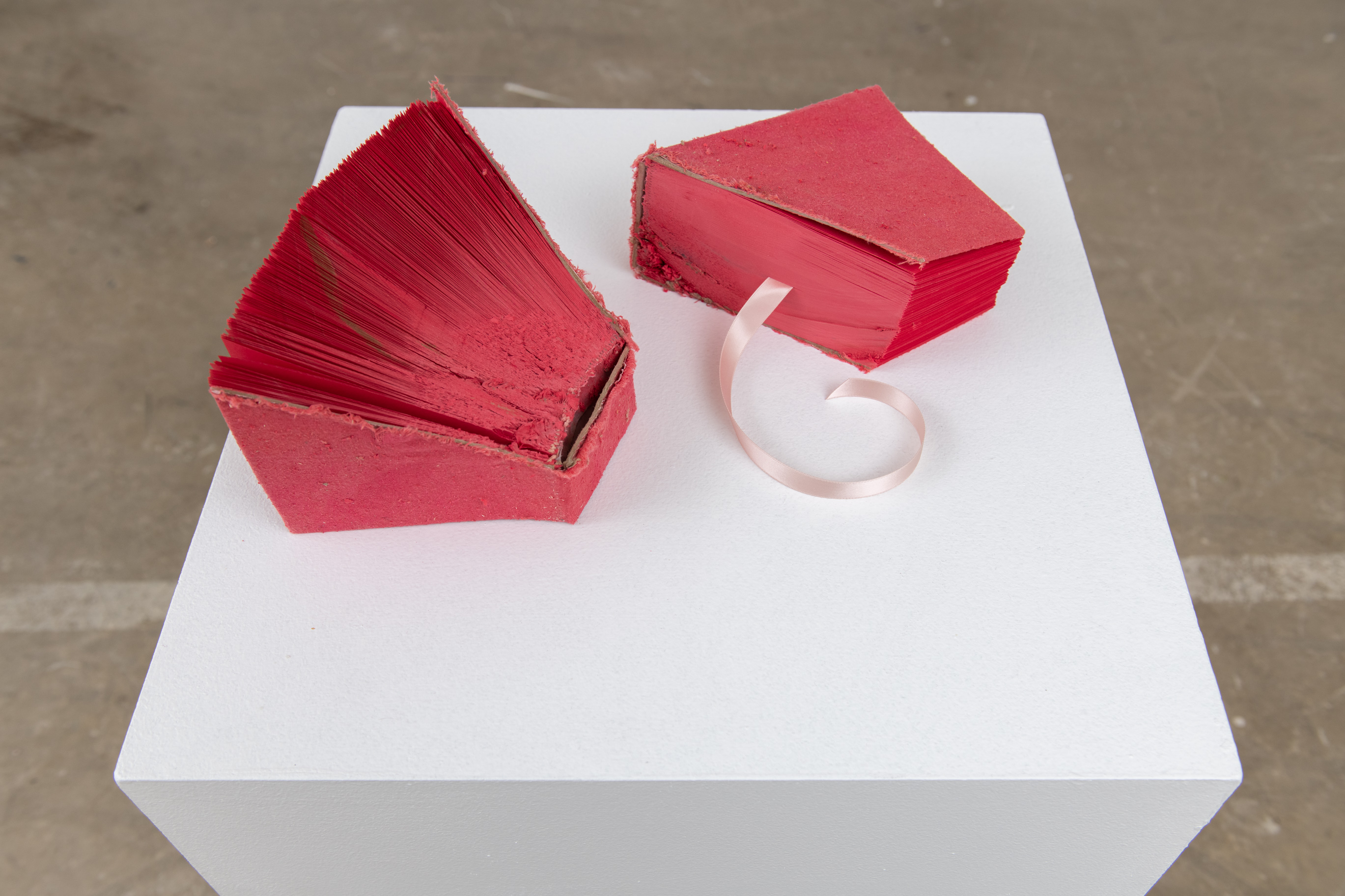 handbound book sawed in half, paper, cardboard, cotton, thread, pva, satin ribbon, 2023